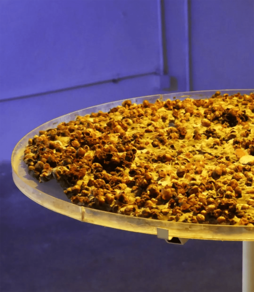 « La reine est utilisée pour créer de nouvelles ruches, elle est le phénomène même d’obsolescence programmé et je dirais-même de stérilisation du vivant. Malgré son absence, les bourdons ouvriers vont travailler d’arrache pied pour récupérer le pollen des fleurs, mais sans la possibilité de faire naître les larves de bourdons déjà présents dans les cocons de la ruche, au final ils se tuent à la tâche pour rien.»
