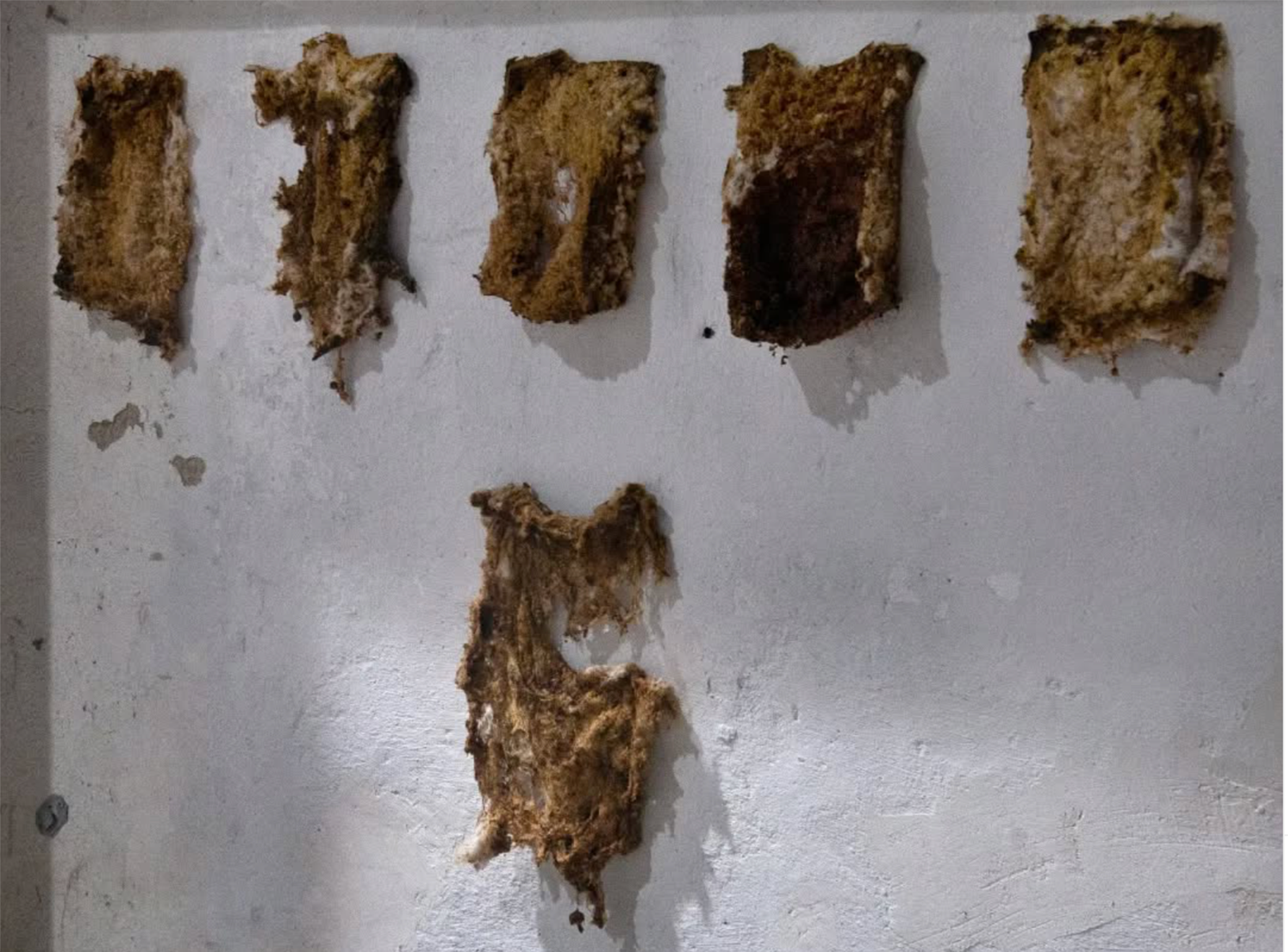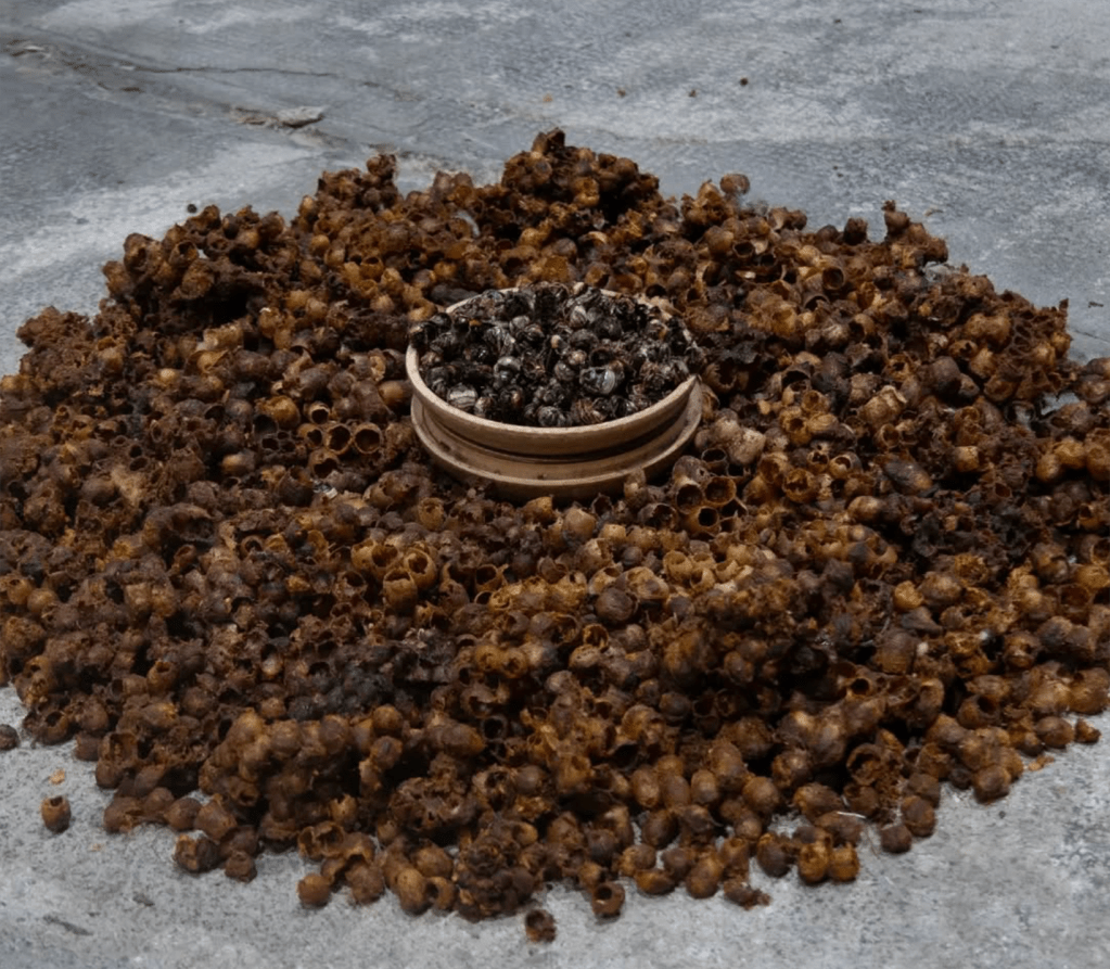 A la fin, c’est l’autopsie de 6 ruches à l’allure de laine de verre périmée qui se retrouvent clouées au mur, comme pendues malgré elles.