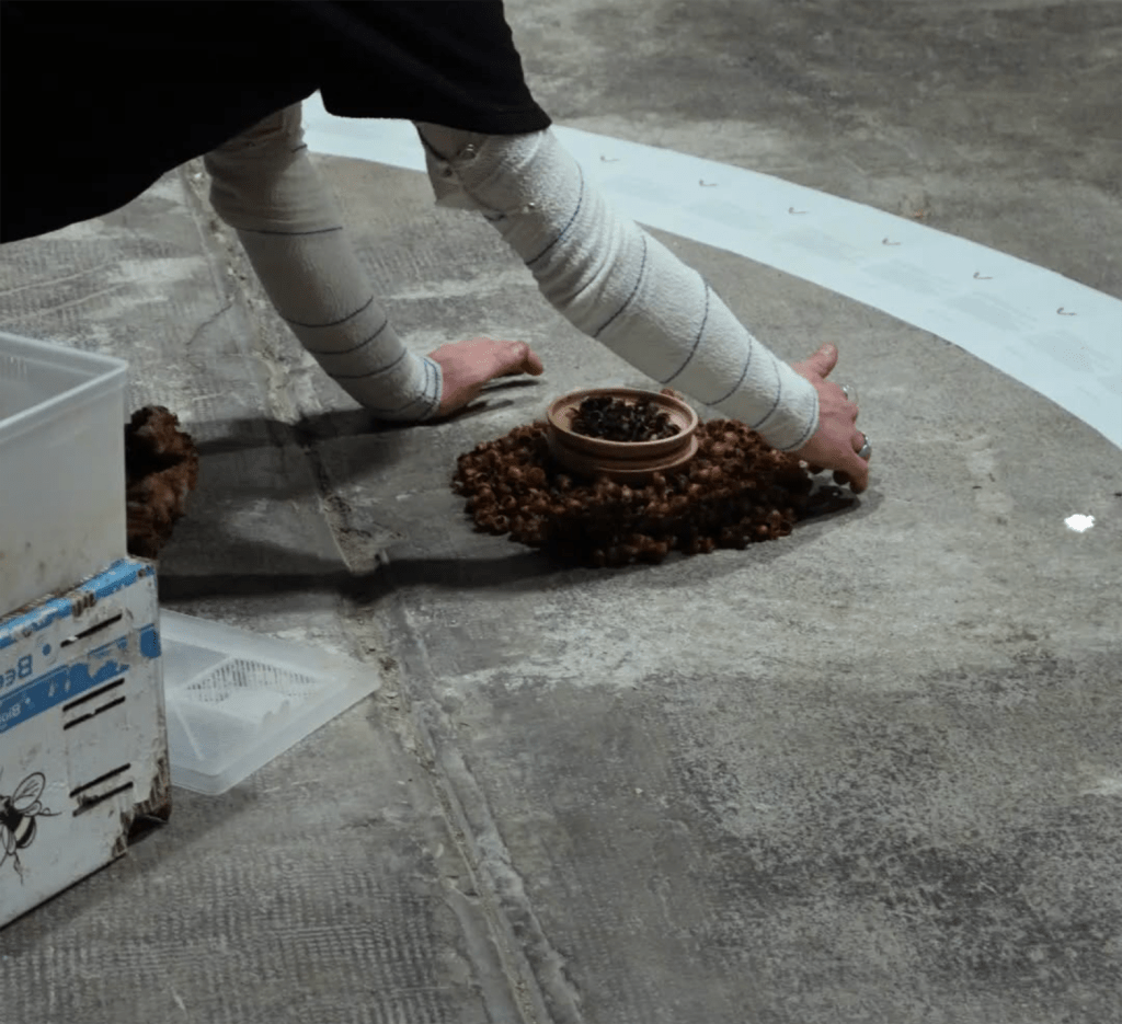 Cette performance, c’est Théo, 3 longues heures, assis en tailleur, les bras bandés, les cheveux attachés, sans un mot. Un ustensile, chirurgical, il retire un à un des centaines de bourdons de six ruches différentes.